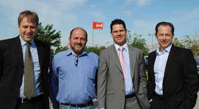 Peddlesden (pictured with the Océ Aust team including managing director, Simon Wheeler on left, with Tim Saleeba and Herbert Kieleithner at this year's Open House in Poing, Germany) believes the change from sheetfed to web digital print will alter the whole production dynamics of the industry. Handling high-speed printing requires a more sophisticated paper handling system as well as complex prepress to get the best from the systems.