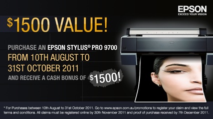 Purchase an Epson Stylus Pro 7700 or Epson Stylus Pro 9700 from an authorised Australian Epson ProGraphics stockist between 10 August 2011 and 31 October 2011 and claim the following cash bonuses:
