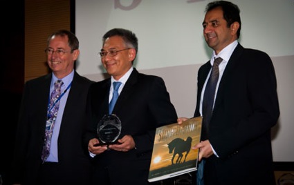 Pictured: Mike English (left), director of Superbrands Middle East awarding the Superbrands crystal trophy to Thirawit Leetavorn (middle), Double A senior executive VP and Mr. Sanjay Chanana (right) Double A general manager in the UAE and GCC.