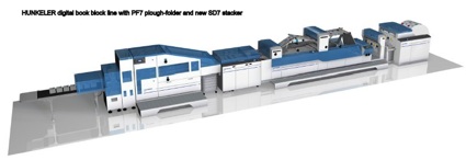 Pictured: the new Hunkeler 30” (760mm) book block finishing line with PF7 plough-folder and SD7 stacker – ideal offline finishing partner to digital book printing.
