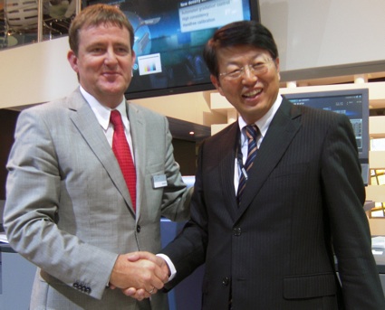 Pictured: A historic meeting of minds: Andy Vels Jensen (left), managing director of Heidelberg Graphic Equipment, Australia & New Zealand, seals the deal to sell digital equipment in Australia with Hiro Kaji, managing director, Konica Minolta Business Solutions Australia, at Ipex last week.