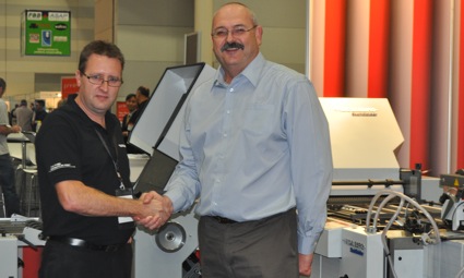 CMYKhub founder Clive Denholm pictured below (right) shaking hands with Brian Evans, postpress product manager for Heidelberg Australia/New Zealand.