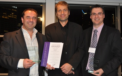 Pictured: Dimitri Dimech (l) and Greg Brown (r) receive the Galley Club award for Australian Printed book of the Year from president, Michael Schulz (centre).