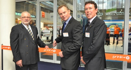 Pictured: All a-buzz over PrintEx, Mitch Mulligan (centre) cuts the ribbon as Peter Carrigan (left) and Ian Martin (right) look on.