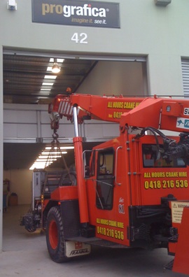 Pictured: A crane moves the new Komori into Prografica's inner-west building.