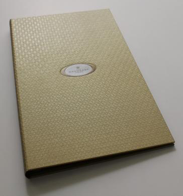 Whites Law Bindery’s winning entry was its Mahogany Room menu holders (pictured), the gold covers of which were UV printed onto white luminescent cloth and then mounted to screen board. The gold was matched to a PMS colour while the wine glass pattern was printed using clear ink embossing.