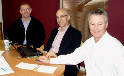 Pictured: (l-r) Simon Leverton (centre) enjoys a relaxed moment with Shepparton, Victoria based Prominent Press sales manager Mark Moylan (left) and managing director Darren Hall (right) after successfully coaching them through their SGP Level 2 certification earlier this year.