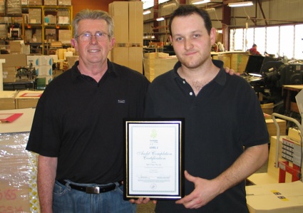 Pictured: (l-r) Managing Director John Bombell and Chris Taylor proudly display the Bell Press Level 2 Sustainable Green Print certification.