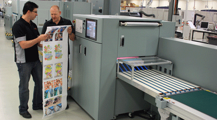 Pictured: (left to right) James Rallis, Salmat production manager, and Stefan Feuerstein, Océ service product manager, checking the first colour run on the Océ JetStream 2200.