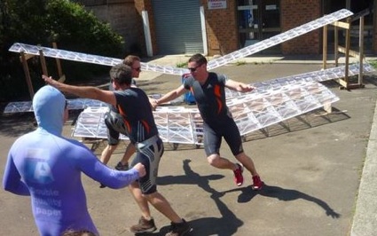 Eaton and his colleagues at Rosemont’s Staging, a theatrical set construction firm in Botany where the plane is being assembled, held a rehearsal last Saturday and showcased the work-to-date. The three ‘pushers’ (including Gary Redman of Roden Print, Sydney) and pilot who will launch the plane made from Gatorfoam, Enviroboard MR and Morane film, on Sunday 7 November at the annual Red Bull ‘Flug Tag’, (Fly Day) in Sydney’s Botanical Gardens, will be dressed as Bavarians and will perform the knee-slapping dance, carefully choreographed with aviation in mind.