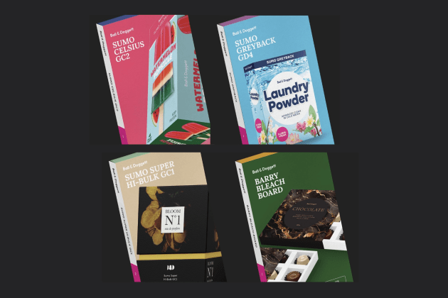 The initial release features four core grades from the distributor’s cartonboard portfolio – Barry Bleach Board, Sumo Super Hi-Bulk GC1, Sumo Celsius GC2 and Sumo Greyback – each presented through a practical packaging format rather than standalone material samples.