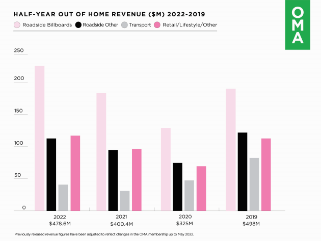 The Out of Home industry’s total half year net media revenue of $478.6m was up 19.5 per cent from $400.4m for the same period in 2021.